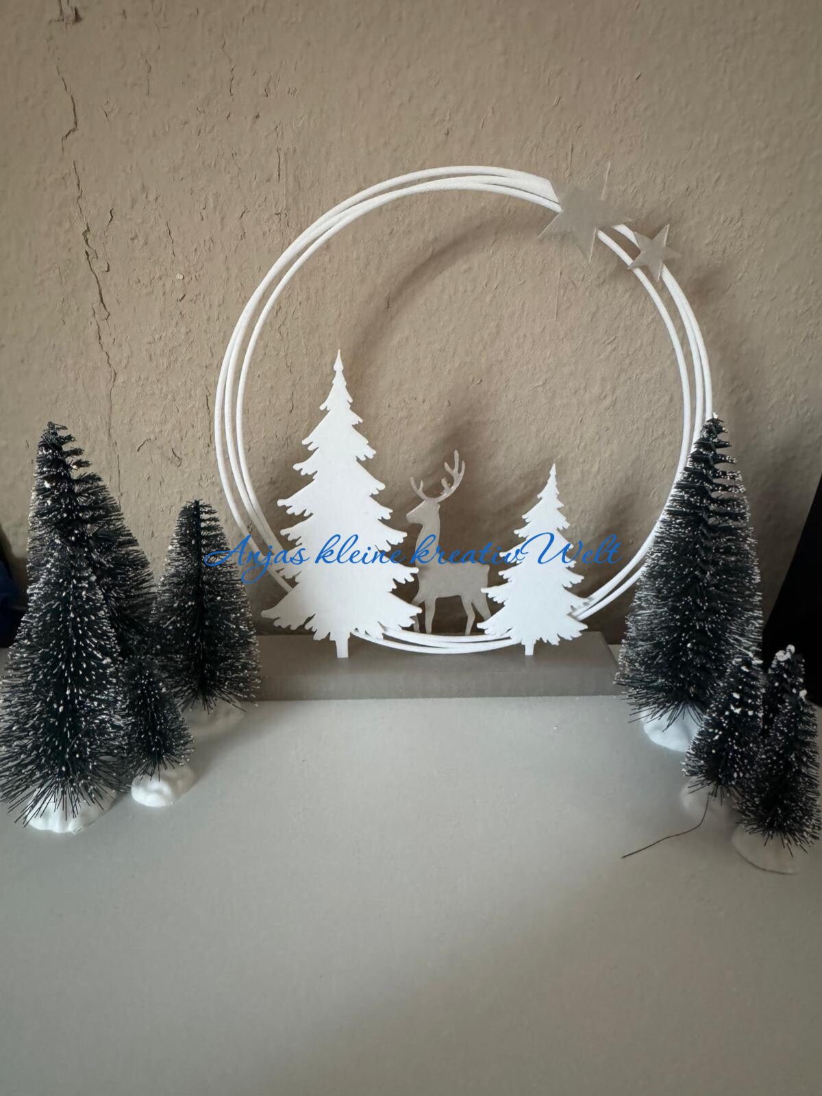 Ein sehr schöner, schlichter Aufsteller. Winterwald mit Reh und Sternen.
